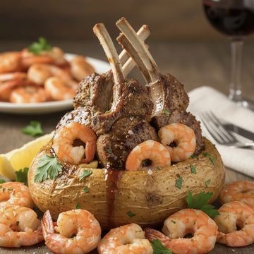 Our showstopper. A hollowed-out roasted gold potato bowl filled with tender, herb-crusted lamb chops and succulent grilled shrimp. Served with extra shrimp on the side.