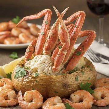 A massive, roasted gold potato overflowing with premium snow crab legs and succulent shrimp. Seasoned with garlic butter and fresh herbs, served with lemon wedges and a side of extra grilled shrimp.