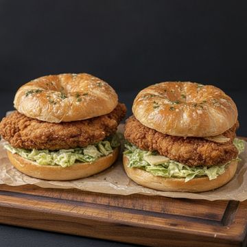 Two toasted garlic-herb bagels stacked with extra-crunchy buttermilk fried chicken, topped with Caesar-dressed greens and Parmesan flakes. Perfect for sharing (or not).