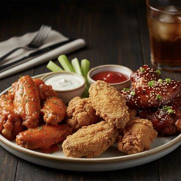Can't decide? Get a mix of our three most popular flavors: Classic Buffalo, Naked Extra-Crispy, and Hot Honey Sesame. Served with celery, ranch, and blue cheese or ranch.